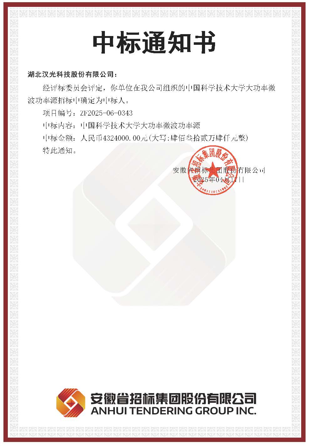 近日,公司收到安徽省招標(biāo)集團(tuán)股份有限公司發(fā)來的中標(biāo)通知書,公司成功中標(biāo)中國(guó)科學(xué)技術(shù)大學(xué)4套大功率微波功率源,中標(biāo)金額總計(jì)432.4萬元。